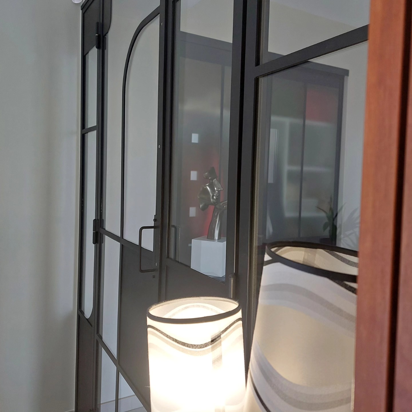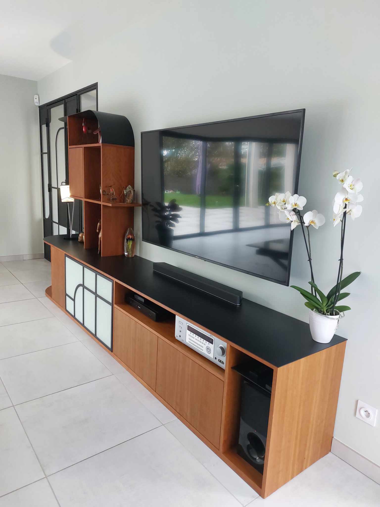 L’intégralité de la structure a été refaite pour obtenir 2 pièces communicantes et lumineuses reprenant certains codes d’époque de la maison: boiserie, parquet, lustre.