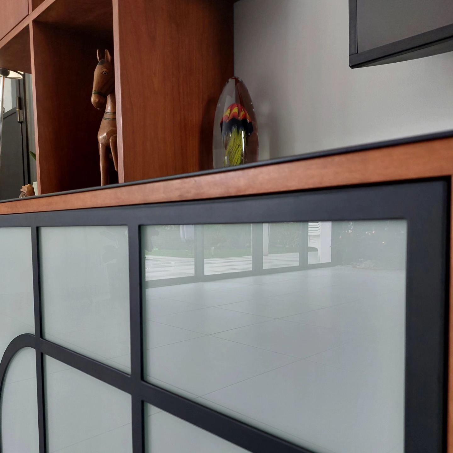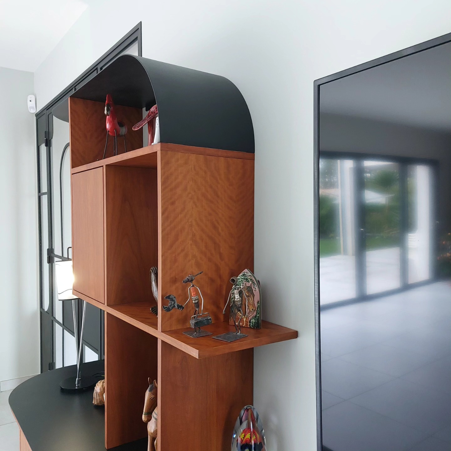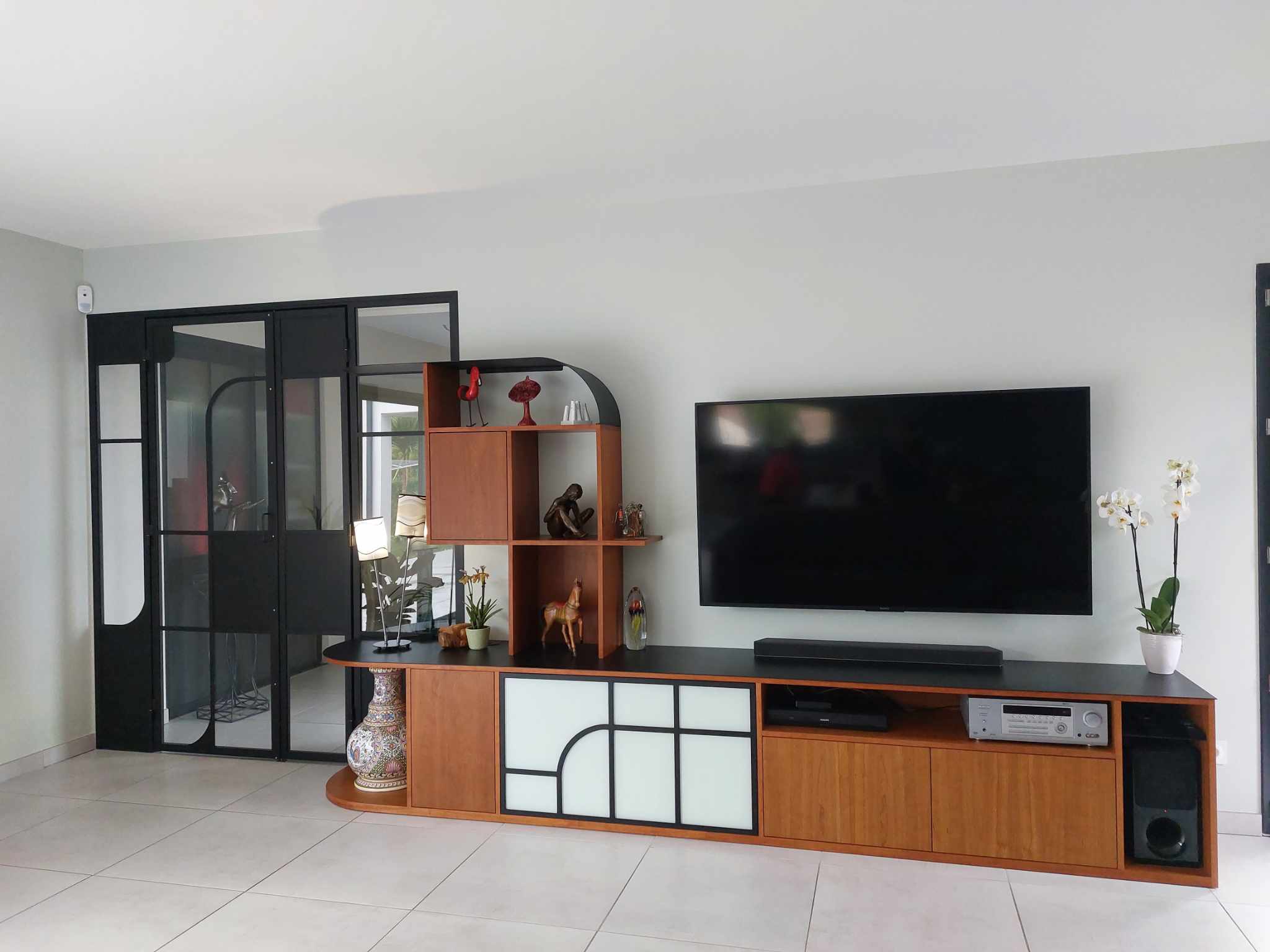 Les boiseries d’origine (éléments forts de la maison) ont été restaurées, et peintes en bleu canard pour amener une originalité et un parti pris décoratif. Les touches de couleur sur le mobilier : blanc, beige, bois, jaune moutarde et la chaleur du parquet équilibre l’ensemble.